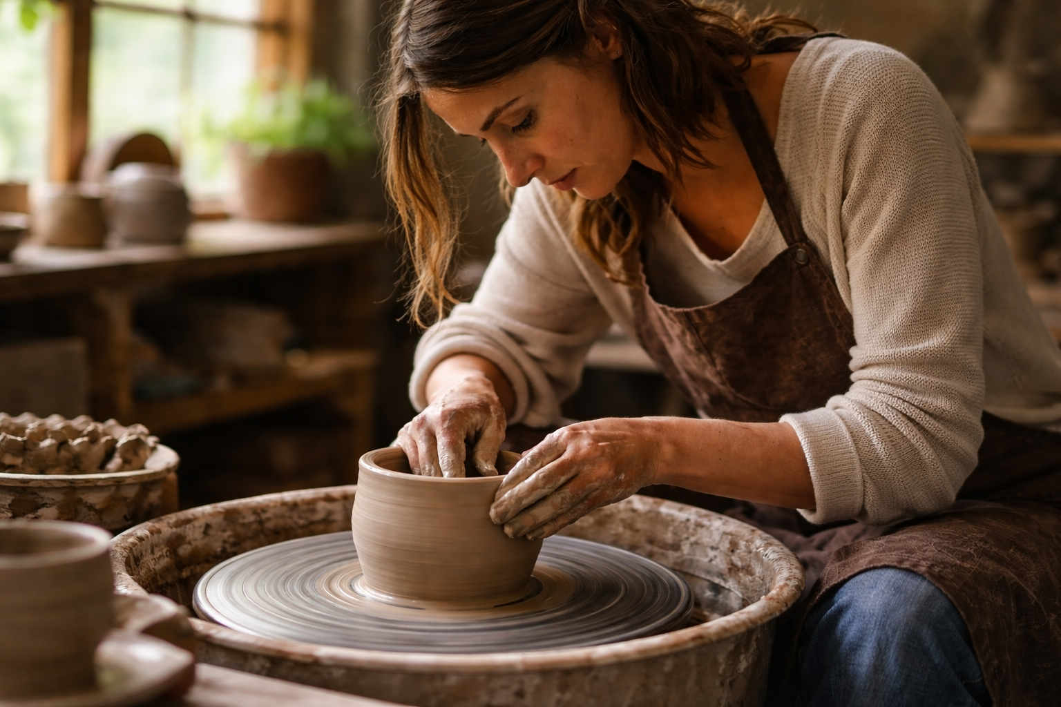 A woman deeply focused on shaping clay, representing Generator energy in Human Design and the power of being absorbed in aligned work.