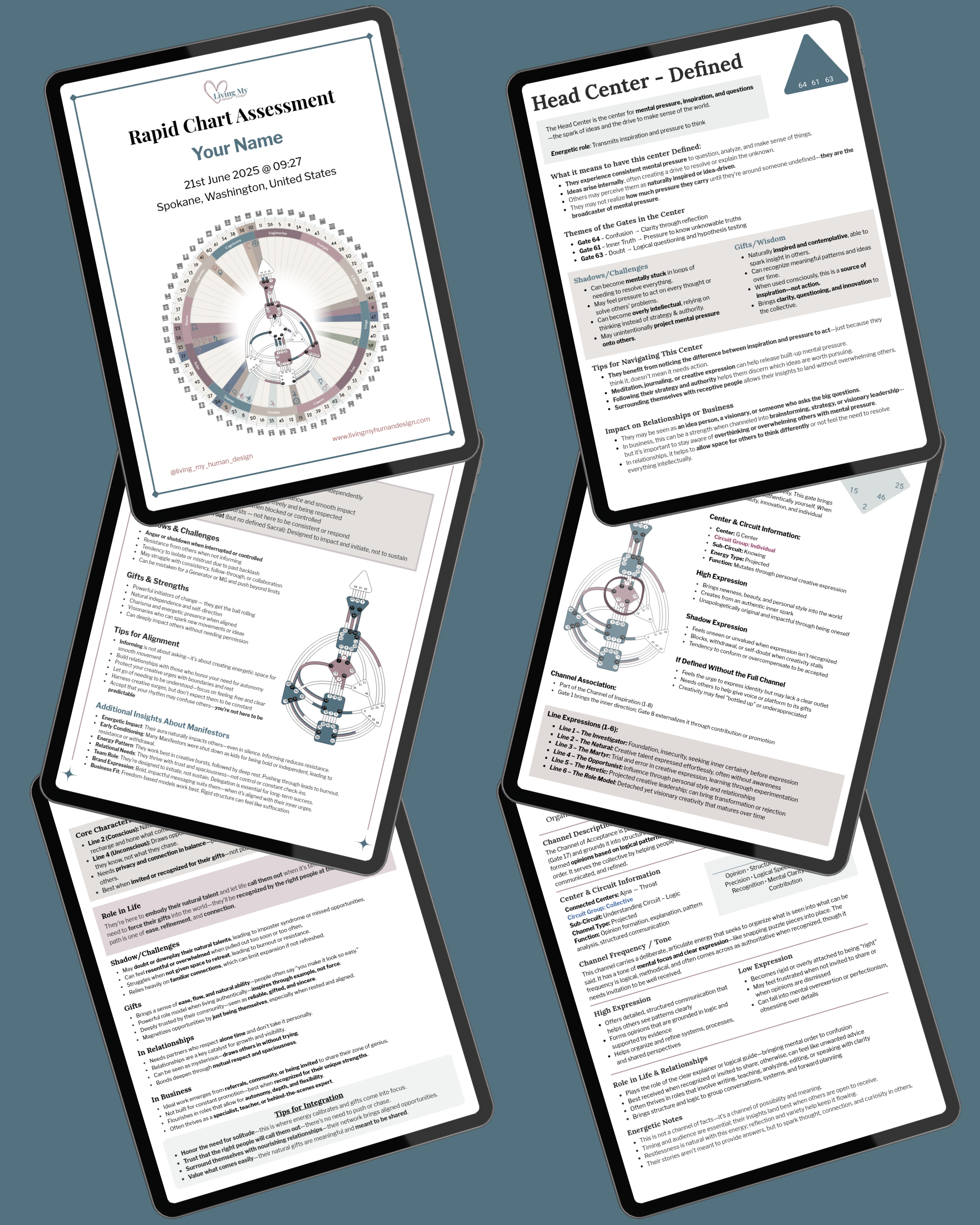 Human Design is a living system, and how it’s understood can vary by teacher, lineage, and lived experience. The insights in the Rapid Chart Assessment Tool reflect my interpretation of Human Design, shaped by my own experimentation, client work, and practical application in real sessions.